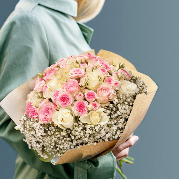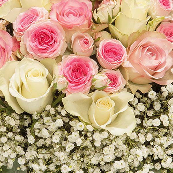 Cette opulente composition laisse sans voix. Les tendrissimes roses aux teintes pastel sont bordées d'un anneau de gysophile délicat qui sublime et met en valeur l'ensemble et transforme totalement ce bouquet rond. Une création aérienne et sensible parfaite pour les occasions particulières.