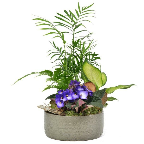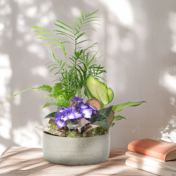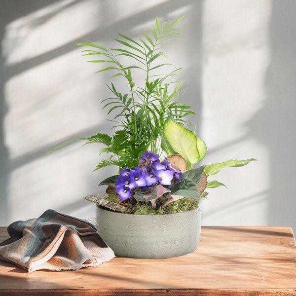 Composition de plantes dans les tons de mauve et blanc avec des plantes vertes et fleuries et écorces dans un panier sans anse beige (le contenant peut varier en fonction des disponibilités et les plantes peuvent varier en fonction des saisonnalités).