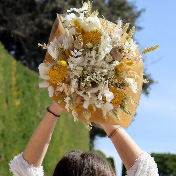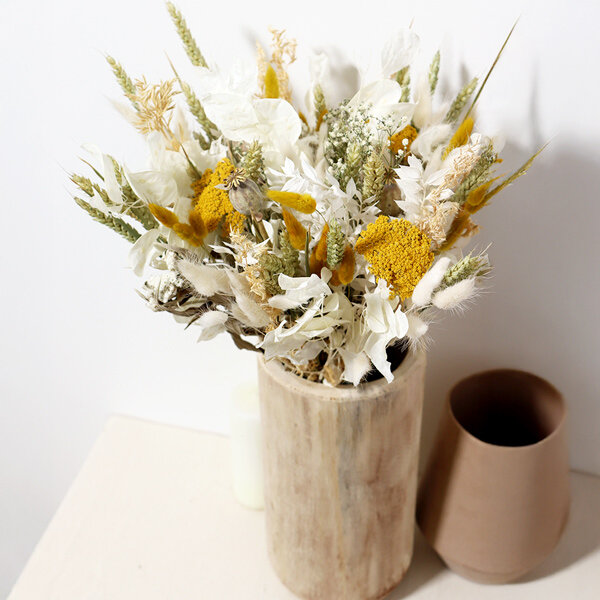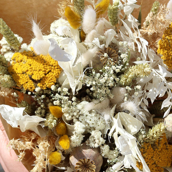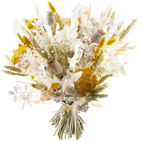 Bouquet de fleurs séchées, dans les tons blancs et jaunes, composé de blé naturel, de lunaria blanc, de lagurus moutarde, de lagurus blanc, d’achillea jaune, de papaver, de gypsophile blanc, de ruscus blanc et d’alpha grass blanc.