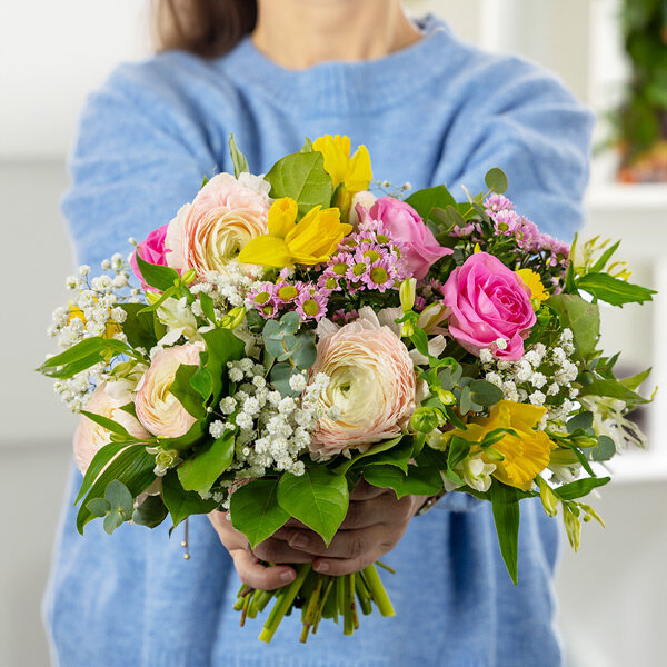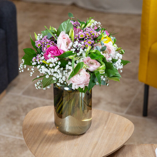 Ce mélange délicat unit la noblesse des roses à la finesse des renoncules, des jonquilles et des alstroemerias. Le contraste harmonieux entre les tons roses et jaunes évoque une complicité sincère, idéale pour transmettre vos sentiments avec une tendresse infinie.