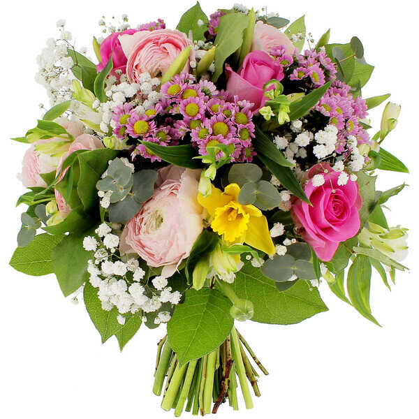 Bouquet rond dans les tons rose, jaune et blanc composé de jonquilles jaunes, renoncules roses, alstromérias blancs, chrysanthèmes roses, roses aqua, gypsophile et sallal.