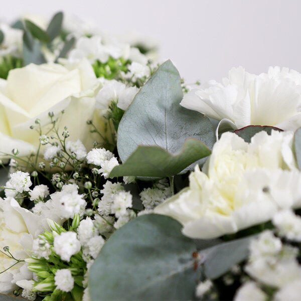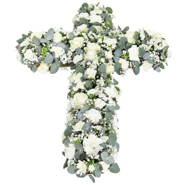 Pensée par nos fleuristes avec soin, cette croix pure et élégante se distingue par son blanc immaculé, couleur de sérénité et de paix. Chaque fleur qui la compose a été sélectionnée pour sa symbolique et sa fraîcheur, créant une composition harmonieuse qui met en lumière la spiritualité et le recueillement lors de ces instants délicats.