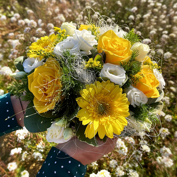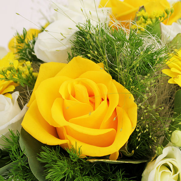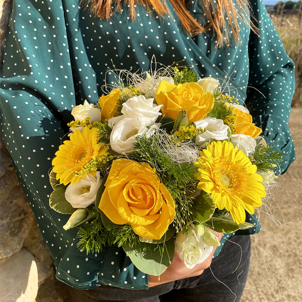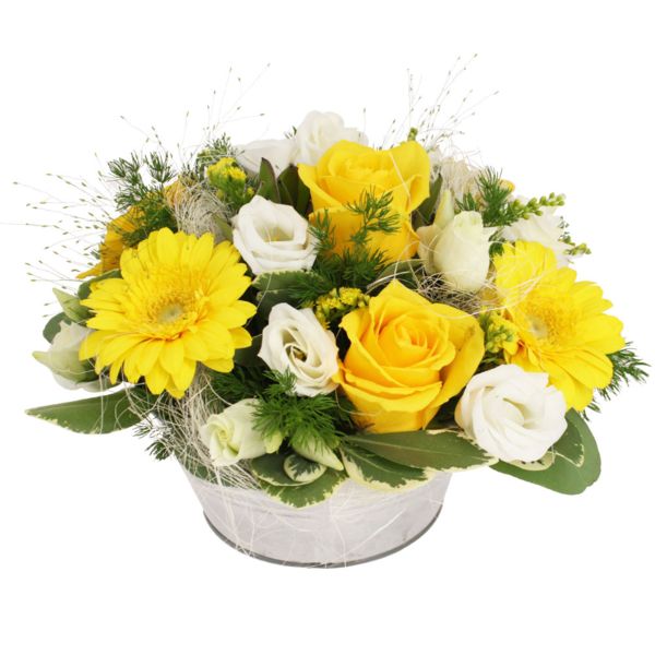 Composition piquée dans les tons jaune et blanc composée de roses, germinis, lisianthus et feuillages divers dans un contenant (le contenant peut varier en fonction des disponibilités du fleuriste en charge de votre commande).