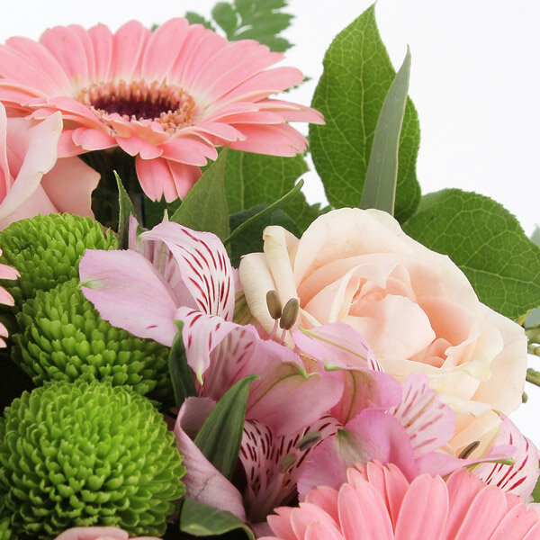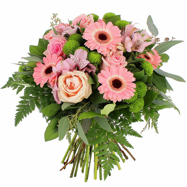 Bouquet rond dans les tons roses et verts, composé de roses, gerberas, alstromérias, santinis et feuillages.