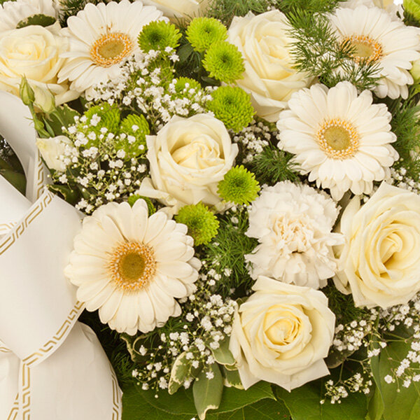 Bouquet rond de deuil dans les tons blanc et vert composé de germinis, œillets, roses et autres fleurs agrémenté d'un ruban en satin blanc.