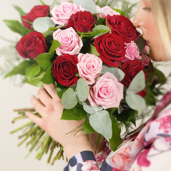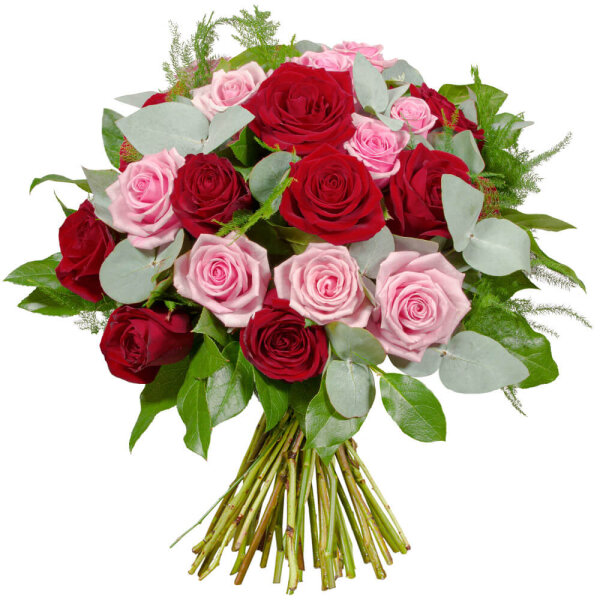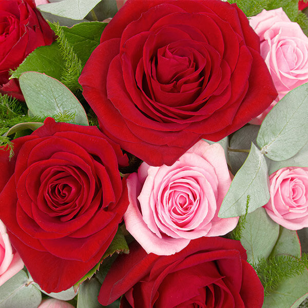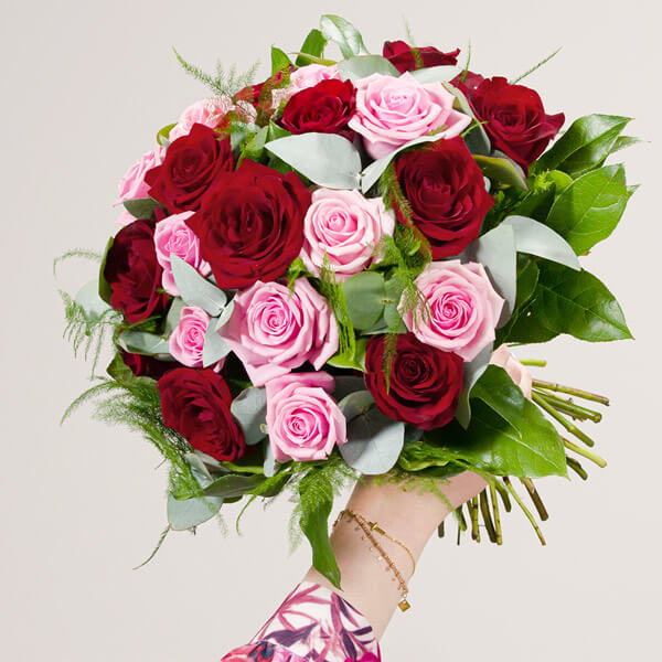 Bouquet composé dans les tons rouge et rose composé de roses et de feuillages.