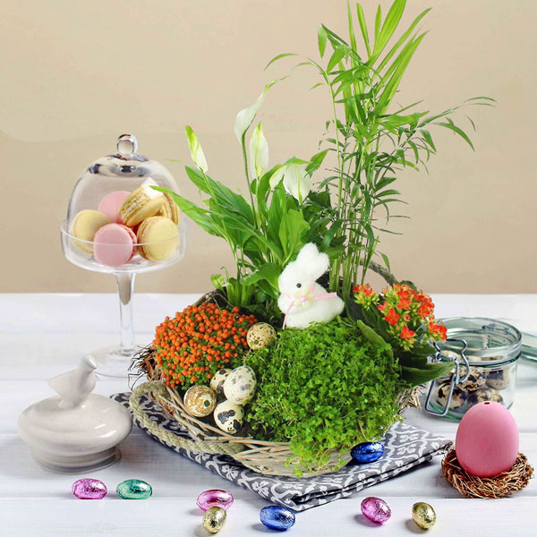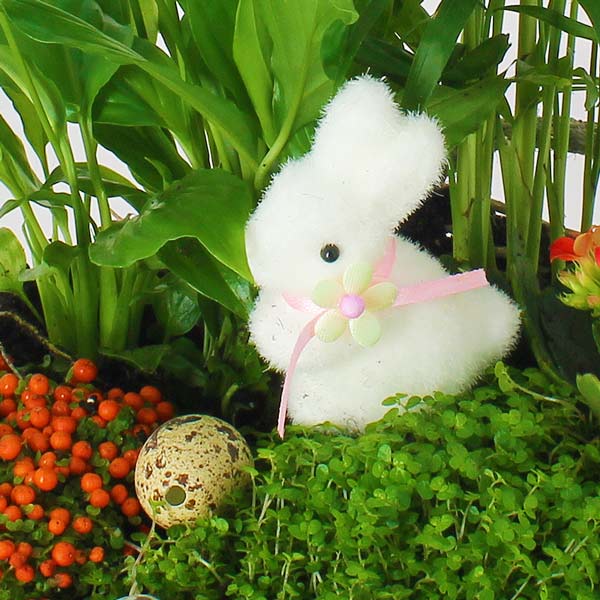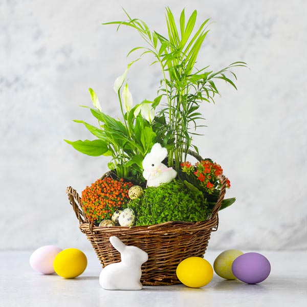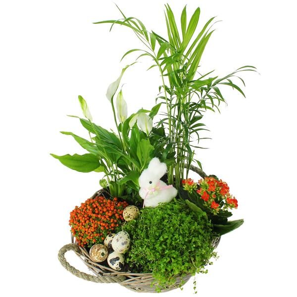 Cette coupe de plantes a sans aucun doute des airs de promenade champêtre. Vous découvrirez les petits œufs symboles de renouveau avant que le mignon lapin vous charme. Par la suite, les plantes pourront être séparées pour poursuivre une longue vie et vous rappeler au bon souvenir de leur destinataire.